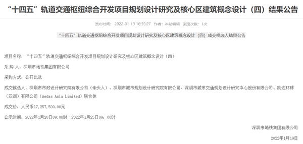 日前,經(jīng)深圳市地鐵集團(tuán)有限公司官網(wǎng)中標(biāo)公示通過(guò),公司軌道交通院作為聯(lián)合體牽頭方參投的“‘十四五’軌道交通樞紐綜合開(kāi)發(fā)項(xiàng)目規(guī)劃設(shè)計(jì)研究及核心區(qū)建筑概念設(shè)計(jì)(四)”喜獲中標(biāo),中標(biāo)金額人民幣1700余萬(wàn)元。