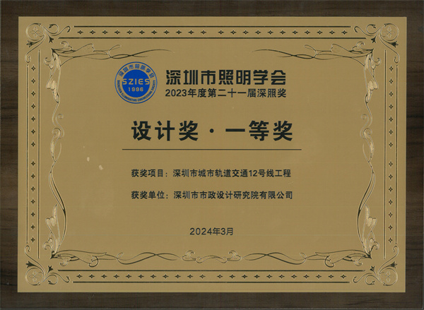 近日,深圳市照明學(xué)會(huì)舉辦了2023年度第二十一屆“深照獎(jiǎng)”頒獎(jiǎng)典禮。公司軌道交通院承擔(dān)勘察設(shè)計(jì)總承包的“深圳市城市軌道交通12號(hào)線工程”榮獲“深照獎(jiǎng)”設(shè)計(jì)獎(jiǎng)一等獎(jiǎng)。