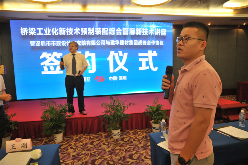 為加強(qiáng)院、企合作,提升院、企技術(shù)水平和創(chuàng)新能力,有效貫徹國(guó)家、省、市建設(shè)主管部門關(guān)于發(fā)展建筑產(chǎn)業(yè)化的相關(guān)要求,促進(jìn)建筑產(chǎn)業(yè)化在市政工程中的應(yīng)用,加強(qiáng)行業(yè)間學(xué)術(shù)和技術(shù)交流,2017年10月13日,“橋梁工業(yè)化新技術(shù)、預(yù)制裝配綜合管廊新技術(shù)講座”暨“深圳市市政設(shè)計(jì)研究院有限公司與建華建材集團(tuán)戰(zhàn)略合作協(xié)議簽約儀式”在深圳舉行。會(huì)議由深圳市市政設(shè)計(jì)研究院有限公司、建華建材集團(tuán)聯(lián)合舉辦,并邀請(qǐng)我國(guó)市政行業(yè)知名專家學(xué)者來深主講,深圳市市政行業(yè)設(shè)計(jì)、施工、建設(shè)、管理單位,以及來自多個(gè)省市的市政行業(yè)領(lǐng)導(dǎo)和相關(guān)技術(shù)人員共200人參會(huì),會(huì)議由我公司徐波總工程師主持。