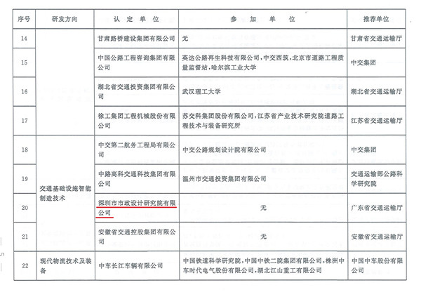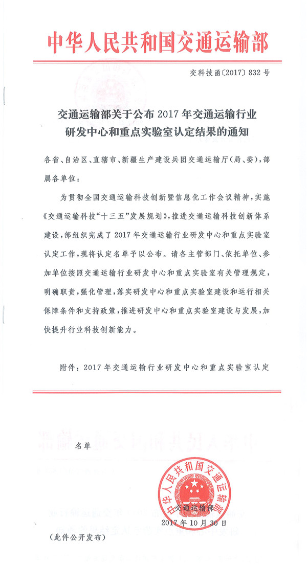 2017年10月30日,交通運輸部公布了2017年交通運輸行業(yè)研發(fā)中心和重點實驗室認定結(jié)果的通知,我公司獨立申報的“交通基礎(chǔ)設(shè)施智能制造技術(shù)行業(yè)研發(fā)中心”獲得認定。本行業(yè)研發(fā)中心的成功認定,是繼我公司于2017年9月成功認定為“廣東省新型橋梁結(jié)構(gòu)工程技術(shù)研究中心”之后,在高水平創(chuàng)新平臺建設(shè)方面的又一新的戰(zhàn)略成果和突破,為技術(shù)創(chuàng)新、成果轉(zhuǎn)化、人才培養(yǎng)、資源共享提供了更加廣闊的發(fā)展空間。