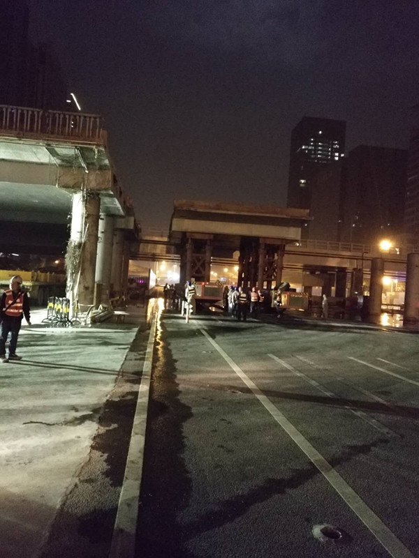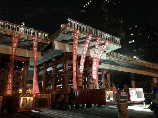 施工單位提前完成橋面設(shè)施拆除、鉆孔、設(shè)備安裝等準備工作后,2017年12月29日晚11點開始拆橋工作,至2018年1月2日凌晨4點深南大道南北兩側(cè)交替封道4晚,彩田橋中間4跨連續(xù)梁采用SPMT模塊車順利拆除。拆除橋梁長度約200m,共切割成22段梁體,單個梁體最大重量達300t,是目前國內(nèi)首座采用SPMT模塊車快速拆除的預(yù)應(yīng)力混凝土連續(xù)梁橋。全橋拆除時間與建設(shè)福田樞紐時60天拆除益田橋相比,時間僅為其1/6,我公司的技術(shù)創(chuàng)新充分證明了“深圳速度”,而且為橋梁工程的發(fā)展增添了寶貴經(jīng)驗。