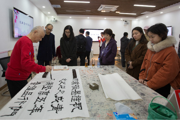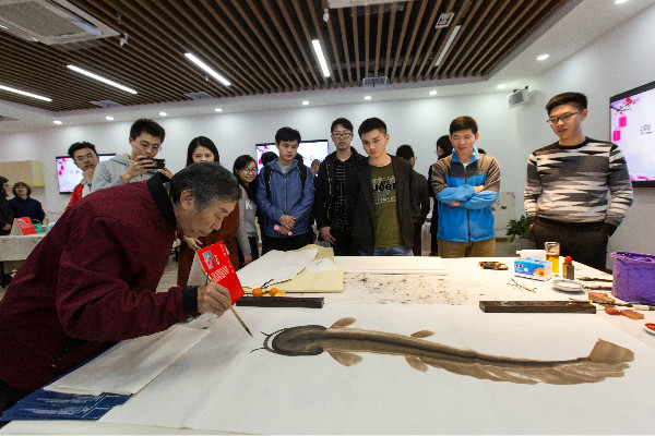 深漂藝術家魏治平老師在創(chuàng)作的間隙,為大家講述了書畫的精神內(nèi)涵以及在新時代下他對書畫的理解,生動地將“青春踐行十九大”、“幸福都是奮斗出來的”、“逢山開路遇水架橋”等文字融入自己的書畫創(chuàng)作中,令在場的青年員工受益匪淺。