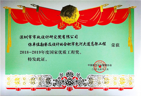 近日,由公司勘察設(shè)計(jì)的合肥市包河大道高架工程獲得2018-2019年度國家優(yōu)質(zhì)工程獎(jiǎng)。