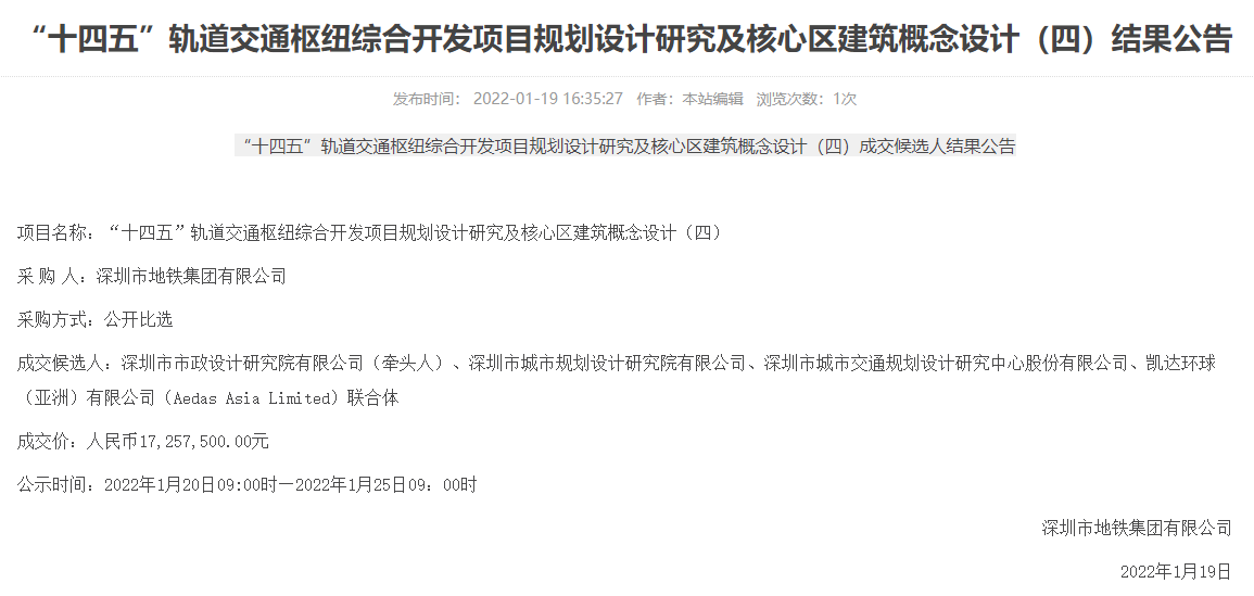 日前,經(jīng)深圳市地鐵集團有限公司官網(wǎng)中標(biāo)公示通過,深圳市政院軌道交通院作為聯(lián)合體牽頭方參投的“‘十四五’軌道交通樞紐綜合開發(fā)項目規(guī)劃設(shè)計研究及核心區(qū)建筑概念設(shè)計(四)”喜獲中標(biāo),中標(biāo)金額...